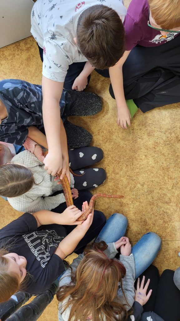 Během hodiny přírodovědy čekalo na žáky 4. ročníku překvapení, které obohatilo probírané učivo o živočiších. Do třídy zavítal živý exponát ze školního zookoutku – užovka červená, která je dlouhodobou součástí našich školních chovů.